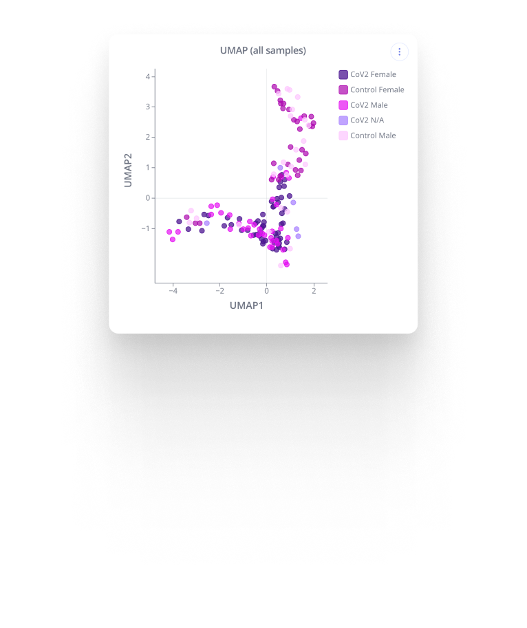 Simplify complex data sets with our dimensionality reduction tools. Utilize PCA, UMAP, and t-SNE to uncover patterns and relationships in high-dimensional data, facilitating intuitive sample clustering.