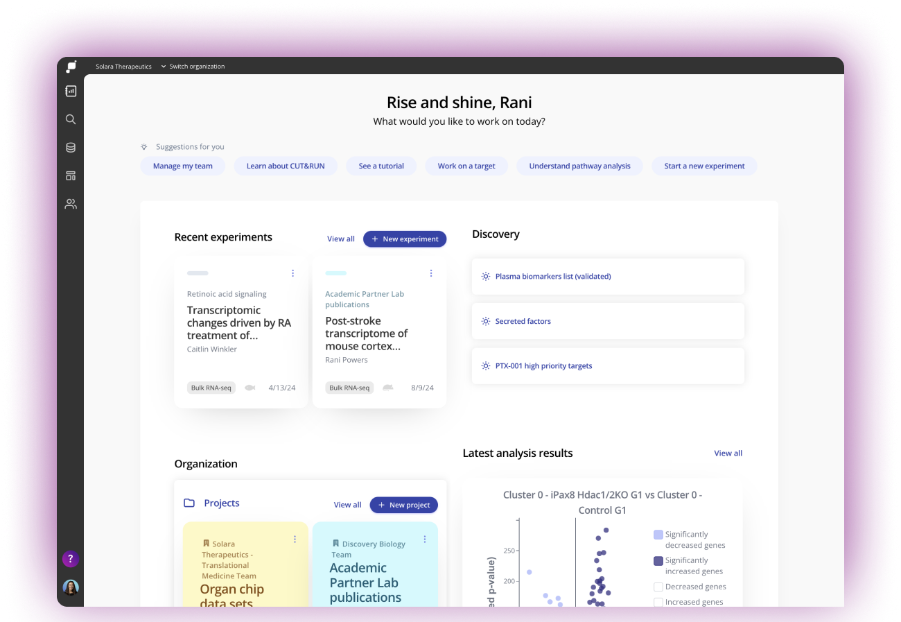 Empower your translational science teams to move faster. Pluto bridges the gap between raw omics data and biological insights, enabling rapid hypothesis testing and biomarker discovery.